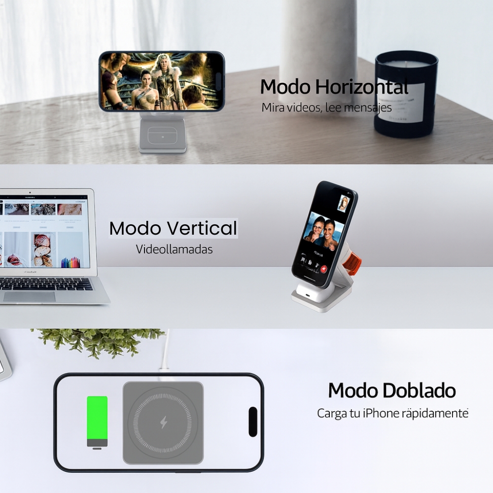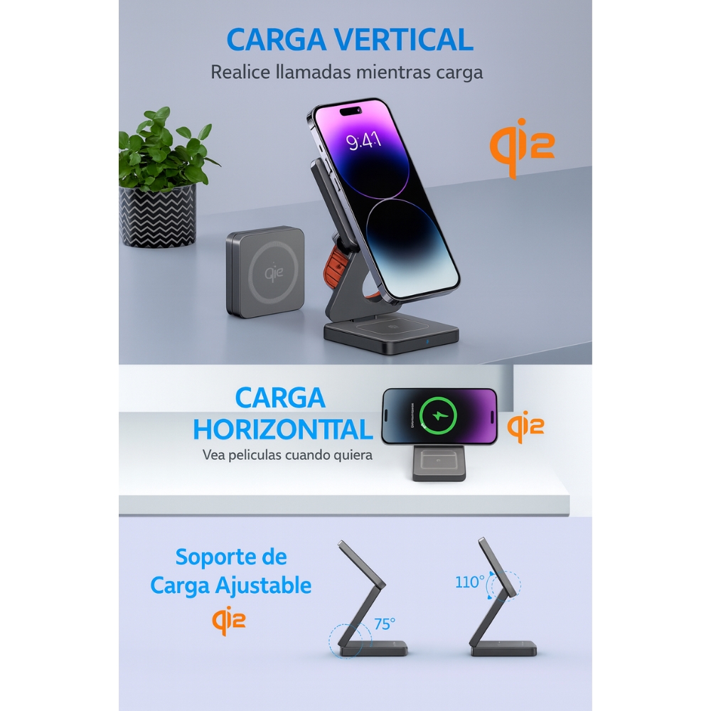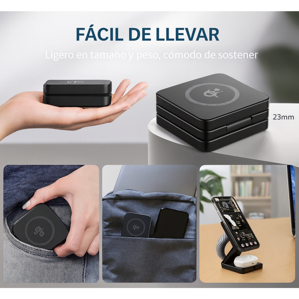 | Compatibilidad | iPhone MagSafe/Qi2 · Android Qi · Apple Watch · AirPods/estuches Qi |