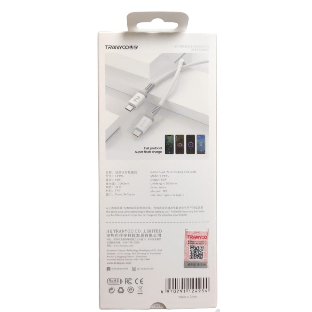 Cable Tranyoo Tipo-C a Tipo-C de 1 metro, soporta hasta 65W para carga súper rápida y transferencia de datos. Ideal para dispositivos USB-C, con diseño resistente y protección contra sobrecalentamiento.