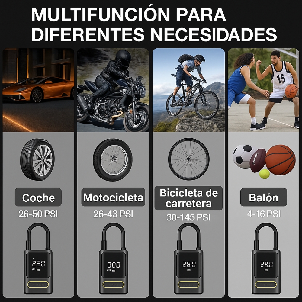 | Modos de Inflado: | Auto, Moto, Bici, Pelota (preconfigurados) |
