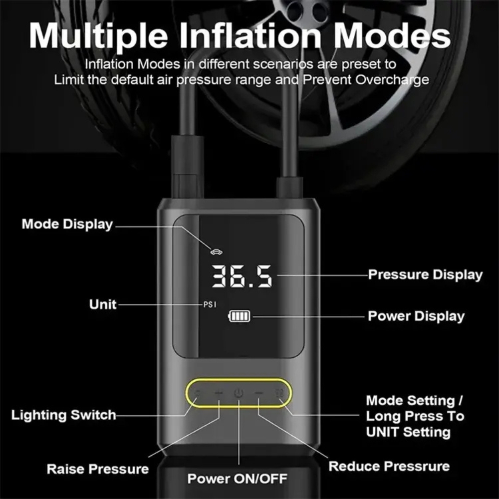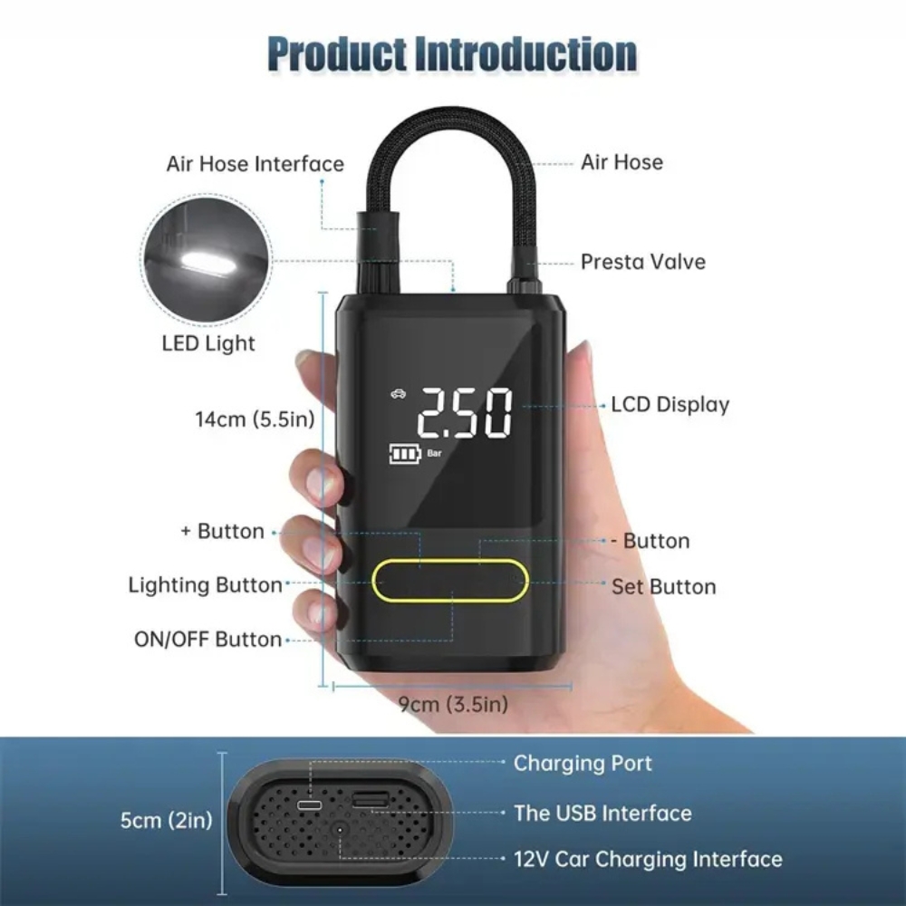 ¡Infla en segundos y sin esfuerzo! Este Compresor de aire es tu aliado ideal para emergencias en carretera, paseos en bicicleta o partidos improvisados. Con pantalla digital, batería recargable y modos automáticos para auto, moto, bici y pelotas, nunca fue tan fácil mantener la presión perfecta. Su diseño compacto, potente motor y linterna LED lo convierten en un gadget imprescindible para tu día a día. ¡Olvídate de las estaciones de servicio!