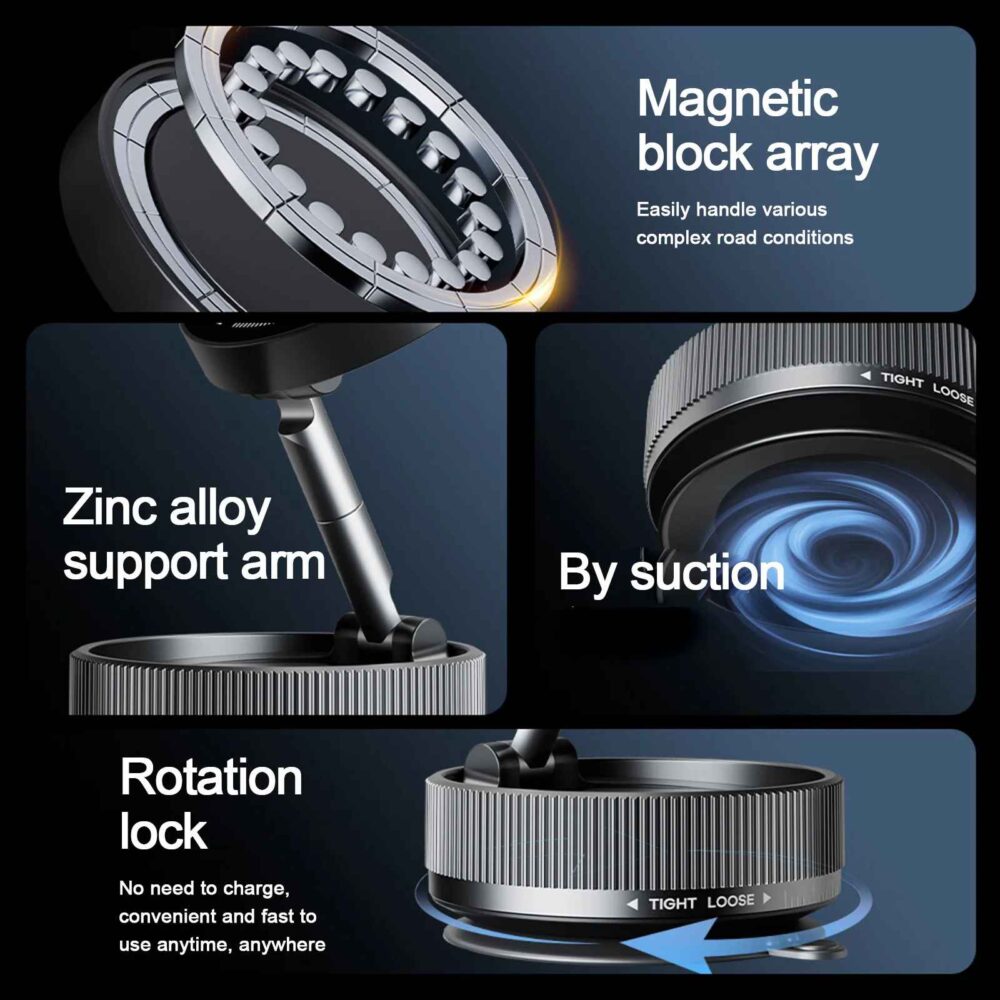 Soporte magnético giratorio de alta gama para smartphones. Con diseño elegante y base de sujeción ultrafuerte, ofrece rotación de 360° para una visualización perfecta desde cualquier ángulo. Su acabado tipo dial metálico le da un toque premium y moderno, ideal para autos o escritorios. Compatible con todos los modelos con MagSafe o placas metálicas.